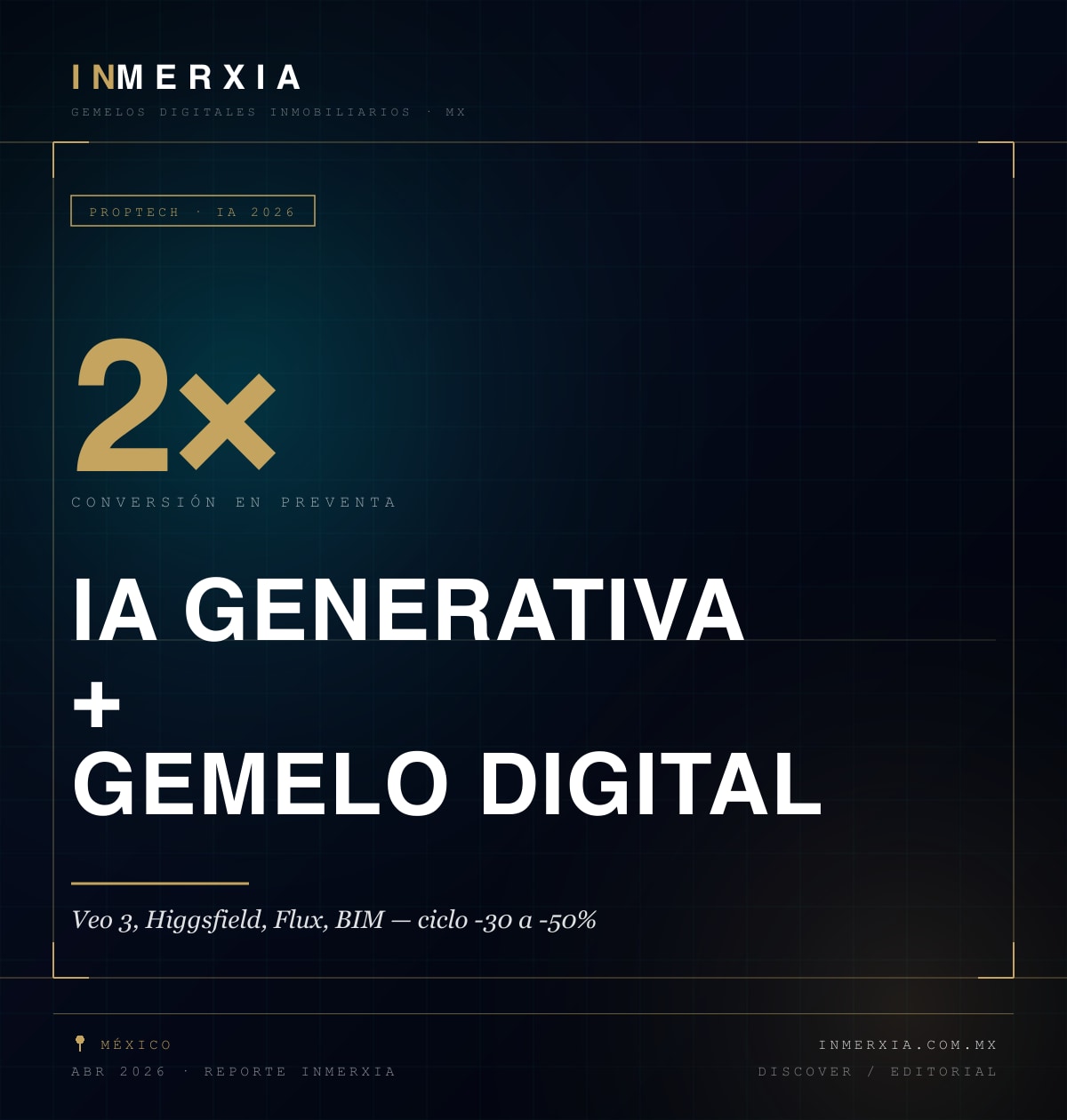 Mientras el mercado mexicano opera con precios en máximos y oferta apretada, los desarrolladores que integran inteligencia artificial generativa (renders, video, variantes de producto) con gemelo digital interactivo están reportando ciclos de venta 30-50% más cortos que la competencia directa. La combinación recorta costos de producción de material visual, acelera iteración y multiplica superficie de contacto digital.