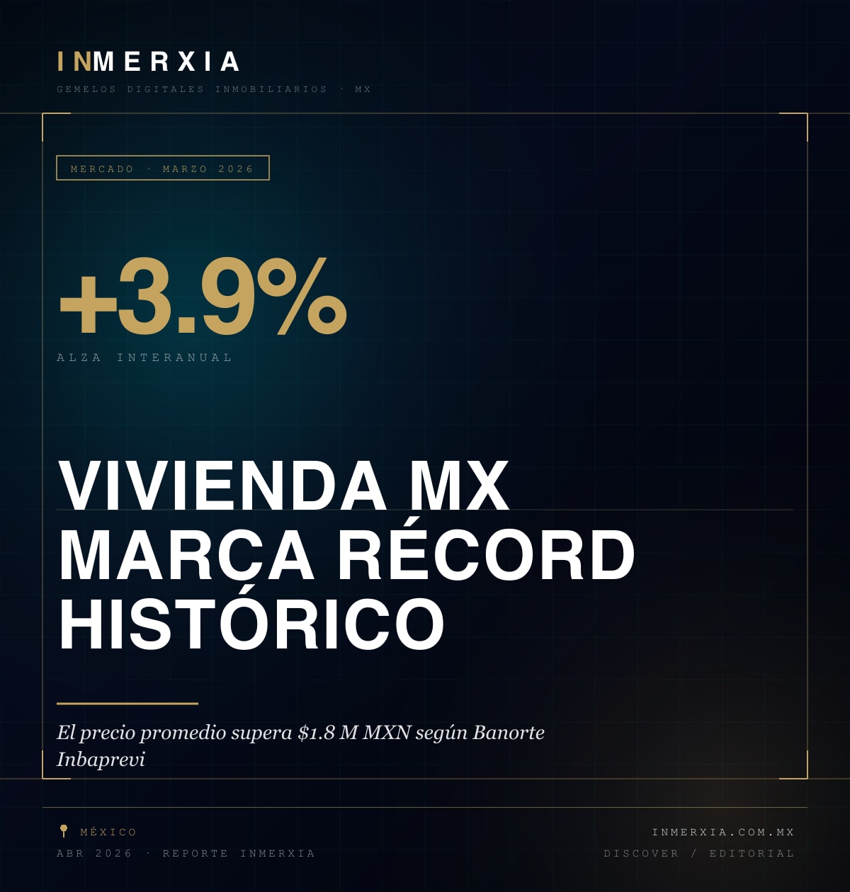 A marzo de 2026, el Indicador Banorte Inbaprevi reportó un precio promedio superior a $1,826,000 MXN, con un alza interanual de 3.9%, el nivel más alto en una década.